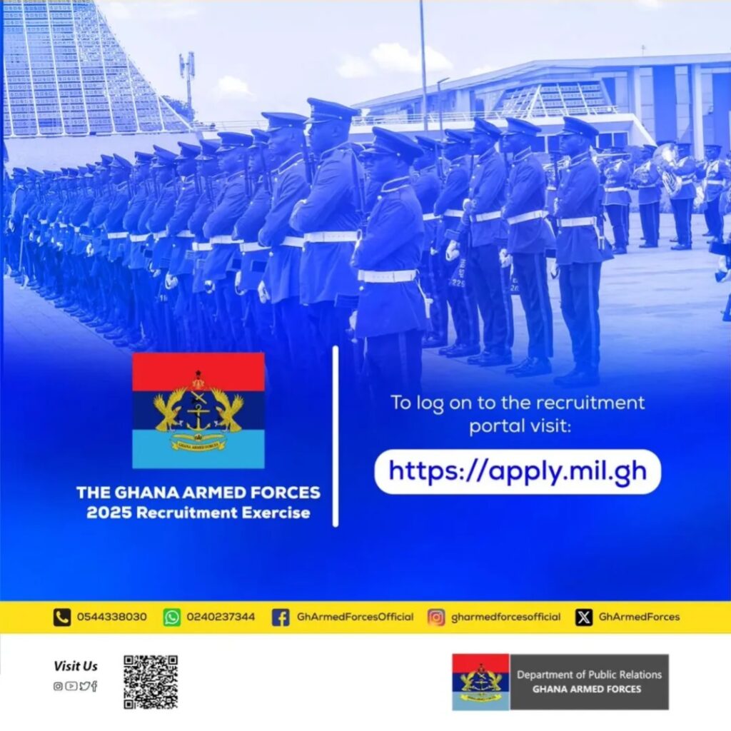 - Recruitment portal (apply.mil.gh): for actual applications and portal support. (Apply Ghana)